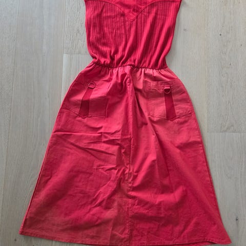 Kjolen knytes bak i midjen.. den er 100 cm når den ikke er knytt.