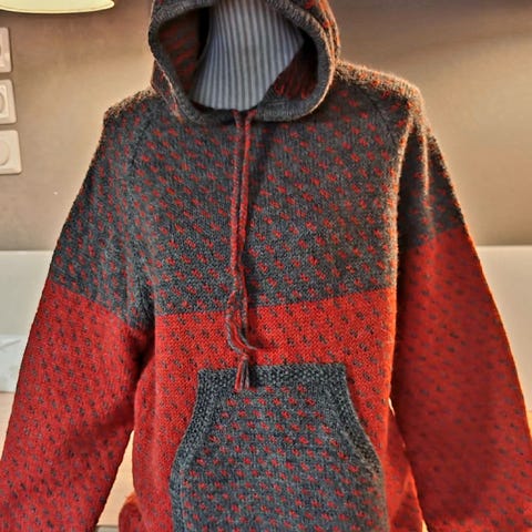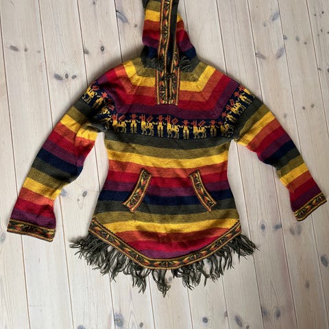 Superkul håndstrikka genser med hette og snor selges.