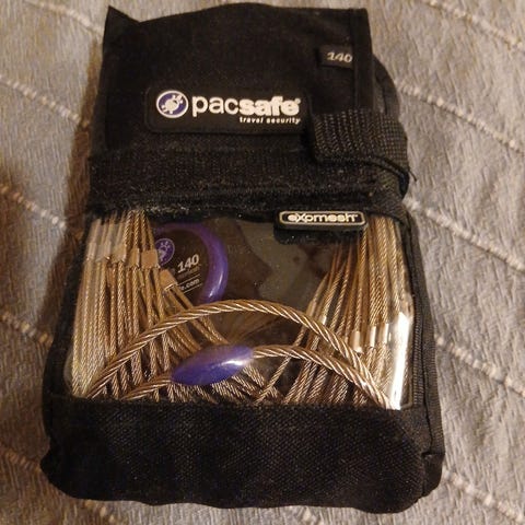 Tyverisikring /stål nett for ryggsekk eller bag opp til 85 l. Brukt en gang. Hengelås følger ikke med.
