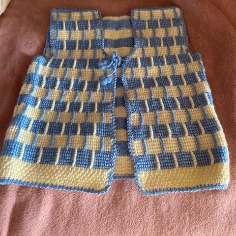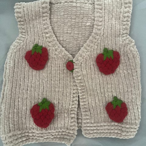 Strikket vest i hvit med plante motiv. Lite pent brukt. Str 1-3 år