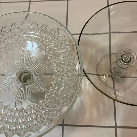 Hadeland stettfat, modell T, pressglass. Høyden er 18 cm og diameter er 23 cm. I god stand, uten skader eller nagg av noe slag.