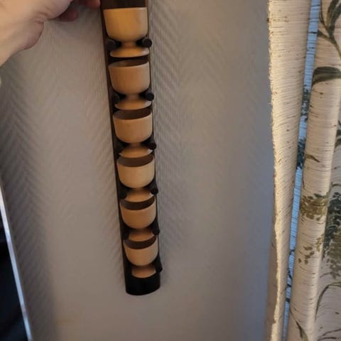 Gammelt eggeglass-holder med 6 eggeglass i tre. Kan monteres på vegg.
