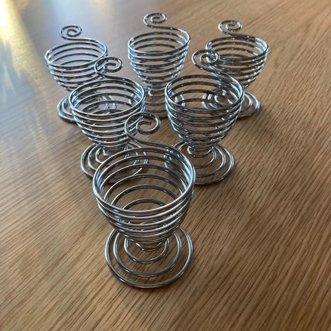 Gammelt eggeglass-holder med 6 eggeglass i tre.