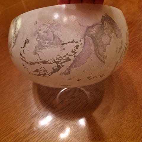 Stor vase i kunstglass av Benny Motzfeldt. Signert Plus BM. Bollen er i melkehvitt glass med dekor i brunt/bronse. Den er 12,5 cm høy og 24 cm i diameter. Den har en ørliten produksjonsfeil innvendig. Se bilde. Ellers er den strøken bortsett fra svake bruksspor på undersiden (synes bare i solskinn).