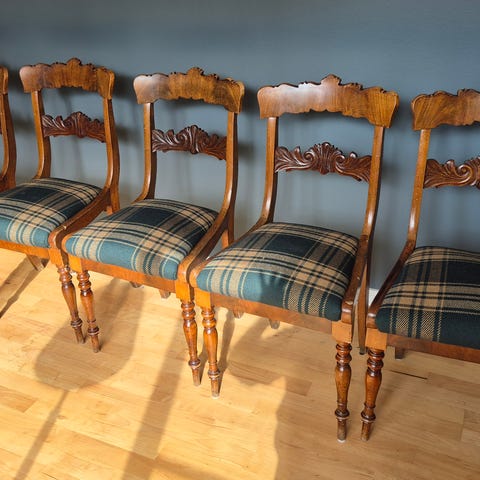 7 spisestoler selges samlet hvorav én med armlener.