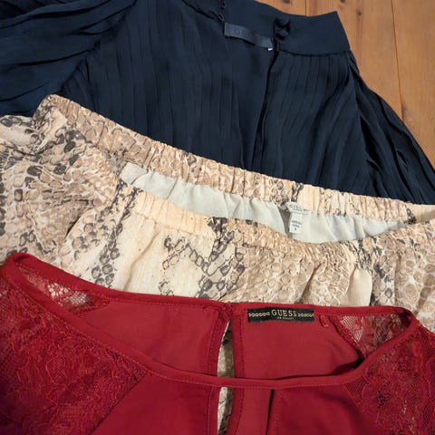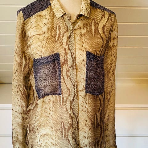 Trenger looken din fortsatt noe vilt, så er en delikat bluse fra Guess akkurat det du trenger, for den lette, løstsittende modellen er kombinert med et leopardprint, som kompletteres med et eksotisk trykk med planter på toppen. Den nedtrekkbare kragen er dekorert med dekorative steiner, og to patchede brystlommer er festet med knapper. Mansjetter med doble knapper og en metalllogo nederst fullfører designet på en kunstnerisk måte.100 % polyester.I utmerket stand