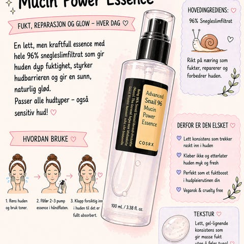 Advanced Snail 96 Mucin Power Essence er en essens av 96 % filtrert sneglesekresjon fra ekte snegler. Essensen refukter og revitaliserer tørr og ubalansert hud, minimerer synligheten av alle typer akne arr, og pigmentflekker for en jevnere hud. Resultatet er hud som føles glatt, myk og sunn. Passer til alle hudtyper, spesielt tørr, sensitiv og akneutsatt hud.