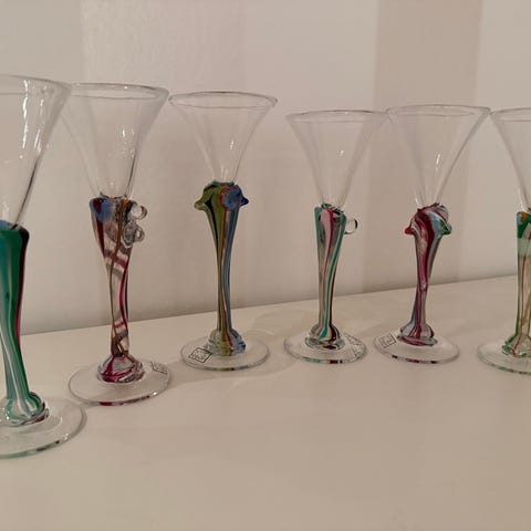 8 flotte kunstglass, signert, for likør eller brennevin fra Glasshytta i Gamlebyen Fredrikstad. 6 av glassene er i samme mønster. Server juleakevitt i håndblåste glass!