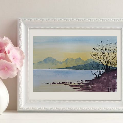 Egenmalt akrylmaleri med sølvfarget sveveramme.