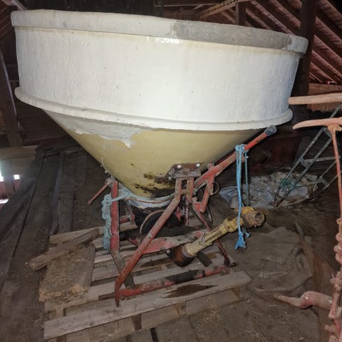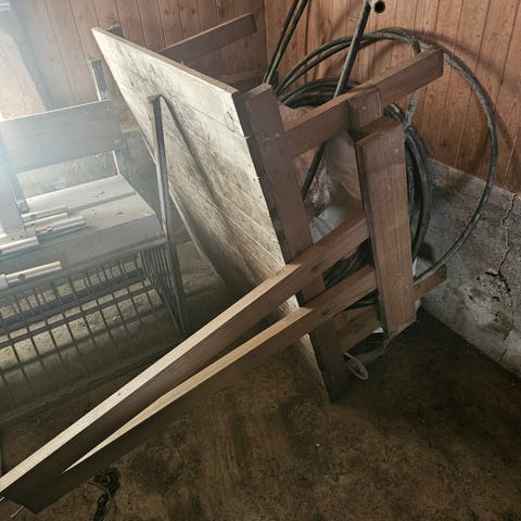 Hjemmebygd sekkestativ til kraftfôr, strøsand e.l i bigbag, for fylling av f.eks trillebår eller tønne. Brukes sammen med tømmeventil (medfølger ikke).