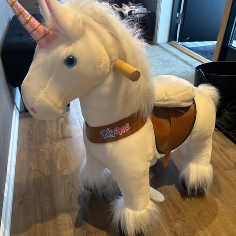 Barna beveger føttene opp og ned på Pedal for å ri på denne unike ponnien.