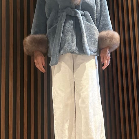 Kåpe av naturlig lama med ekte skinnbasis, i lengde til setet – lett, luftig og varm. Gir antrekket et luksuriøst og voluminøst preg, og passer perfekt til både jeans, kjole og kveldsantrekk.
