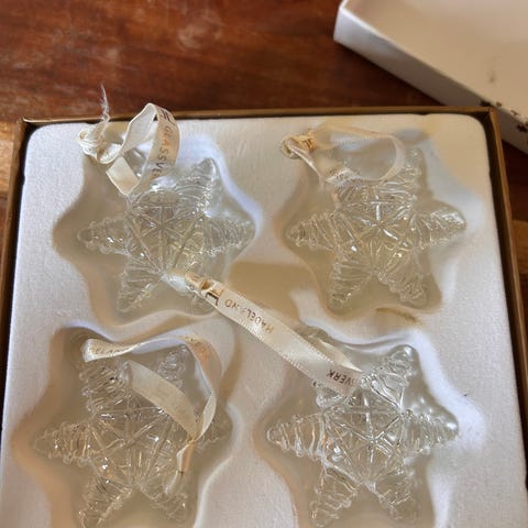 2stk snøfnugg i glass selges samlet. Juletrepynt i glass. Ligger enda i esken. Perlemor-finish. Noe bruksmerker/slitasje kan forekomme. Selges som den er. Se bilder.