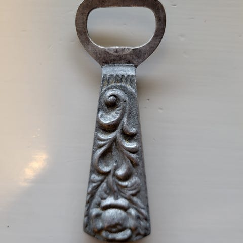Flaskeåpner i tinn med stilig mønster.