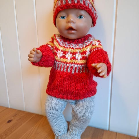 Inneholder strikka genser, sydd bukse, sokker og knytelue. 260kr + porto