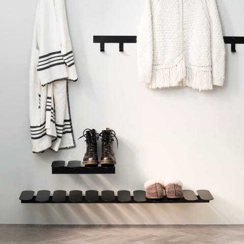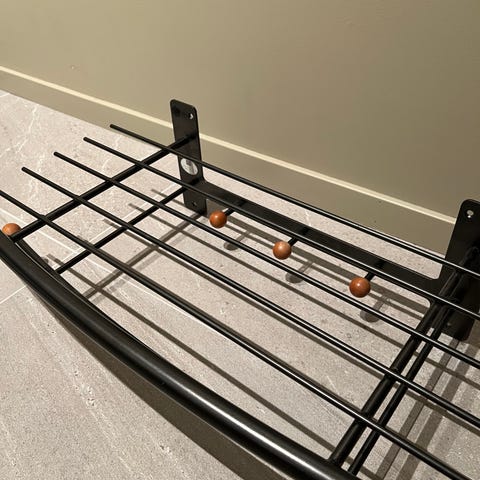 Hattehylle med klesstang, produsert i MDF og massivt gummitre malt med vannbasert farge. Hattehyllen monteres på veggen i den høyden du ønsker. Den har klesstang til kleshengere.
