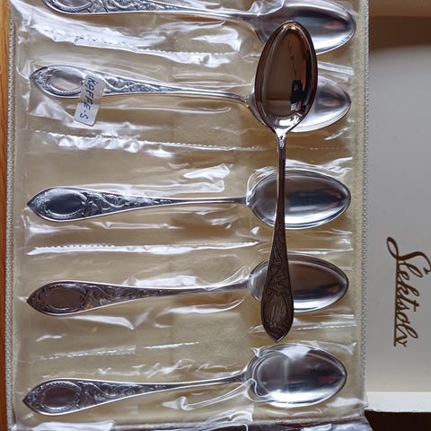 2 stk Sølvskje kaffeskje. Th.Marthinsen. sølvplett 60. Aldri brukt. Ligget i skuff, trenger en puss. Selges samlet. Kan sendes I post mot porto.