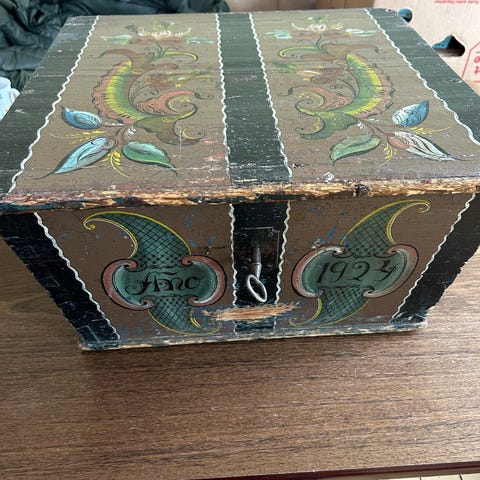 Gammel rosemalt kiste selges. Kisten er i god stand og har stått innenhus i alle dager. Har vært gasset for mit ca slutten av 80 tallet. Ingen mit aktivitet sett i kisten i ettertid.
