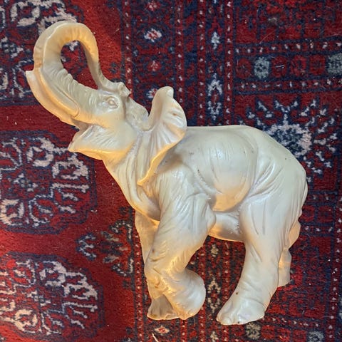 Fin, gammel elefant i porselen/fajanse - 13 cm høy og 17 cm lang. Uten skader, kr. 140,-.