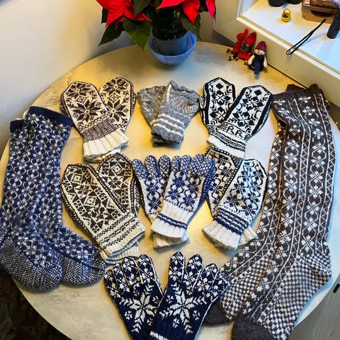 Masse forskjellig ullstrikk. Ullsokker, ullvotter, lue, pannebånd. Selbu, marius og mye annet