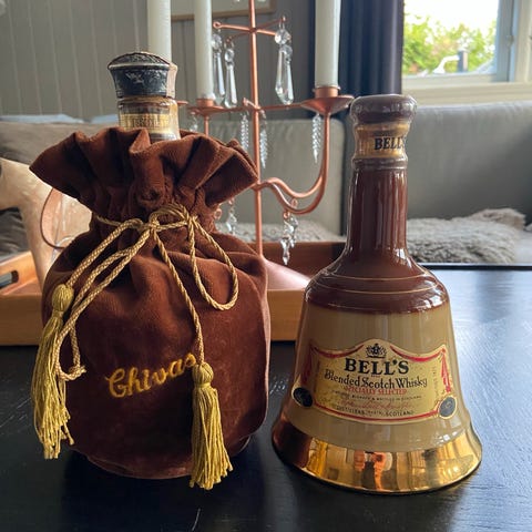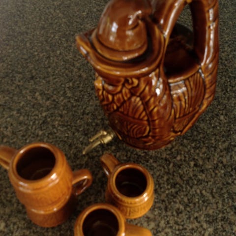 Whisky tønne i keramikk med tilhørende seks små krus med hank