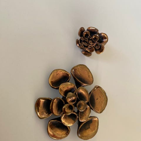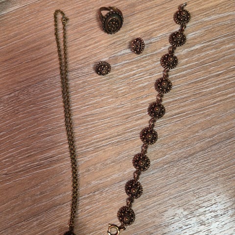 Armbånd lengde, ca 17,5 cm. Øredobber ca 4 cm. Kjede dobbelt ca 30 cm. Anheng diameter ca 4 cm. Jeg har dessverre ikke mulighet for å sende.