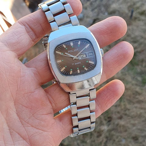 Produsert i Sovjetunionen av den første Moskva urfabrikken. Ganske sjelden modell. I samlertilstand. Gylne timemarkeringer. Trekker opp og går utmerket.