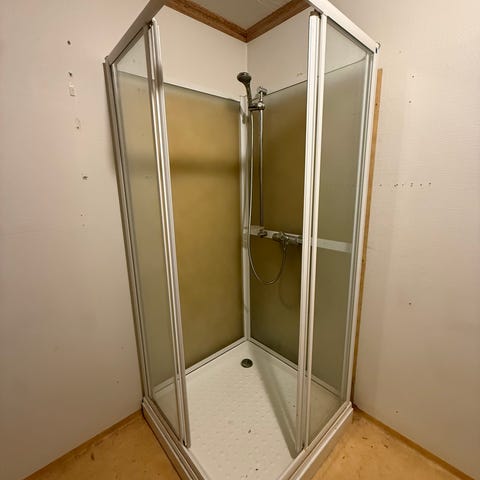 Vi pusser opp badet og selger dusjvegg med mål: 90x210 med glasstykkelse 8 mm.