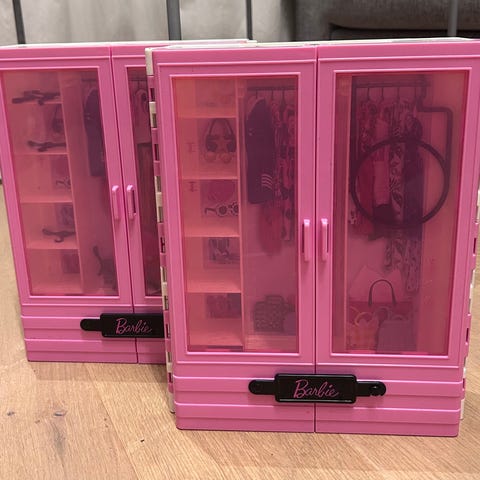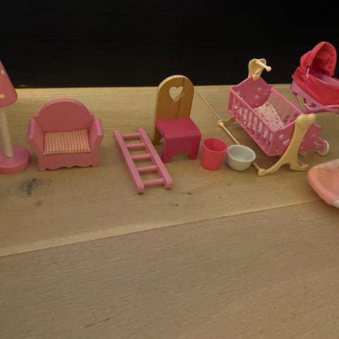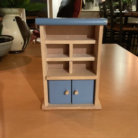 Søtt dukkeskap med 4 kleshengere. Ca 51×30×25 cm. Mye brukt i lek, bude som skap og bolig:)