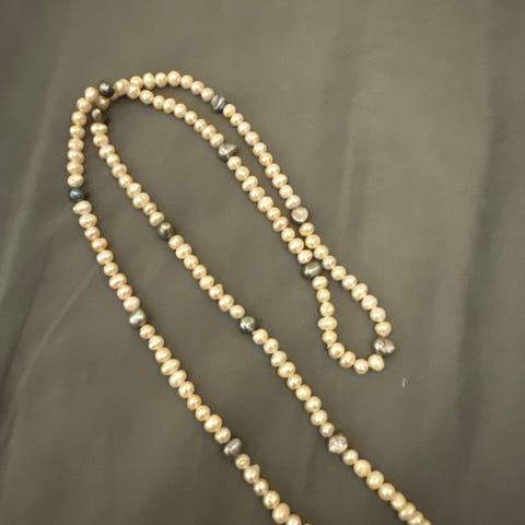 Smykker i tre, bein og farget sten, noen tredd på lærsnor.