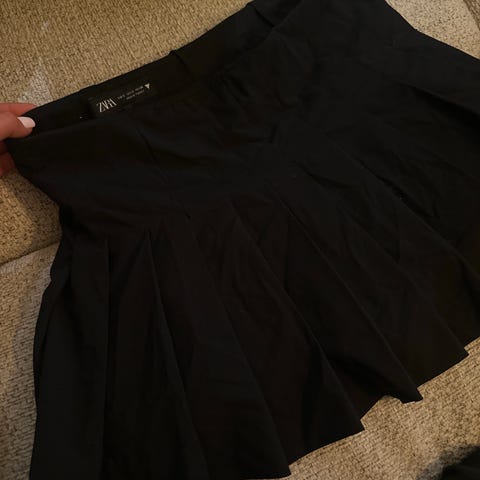 Skjørt fra Zara i glinsende mørk blått stoff (kommer ikke helt fram på bildene) selges for 300,-. Det er kort og går til over knærne. Skjørtet er i fin stand og brukt bare et par ganger. 🌟
