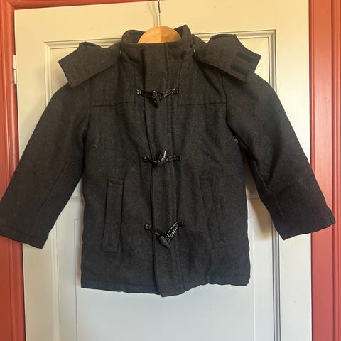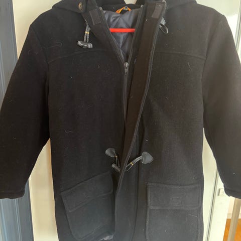 Lite og pent brukt duffelcoat. Avtagbar hette. Et lite hull, i sømmen, i innerlomme på venstre side. Synes ikke og kan lett sys.
