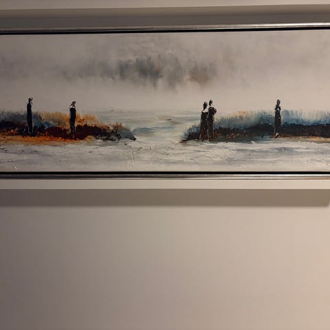 Strukket på solid treramme. Opphengskroker på baksiden. Se bildene for detaljer.
