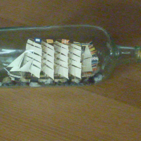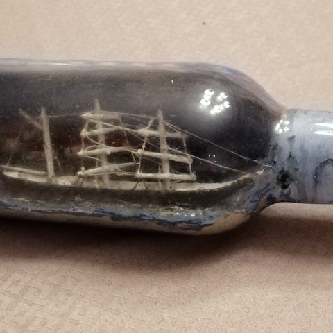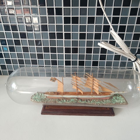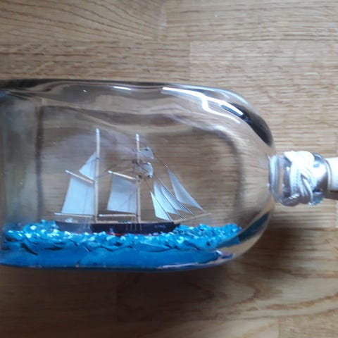 To flaske skip Viking er navnet på båten med svensk flagg, Gøteborg er gravert inn på flasken som ligger i en trekrybbe. L: 20 cm. Seilbåten med det danske flagget ligger på en keramikk plate lengde på flasken er 30 cm. Begge i fin stand uten skår/skader. Kr. 900,- pr. stk.