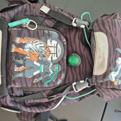 Pent brukt Beckmann skolesekk og gymsekk med enhjørning motiv, reflekser og lys for mørke dager på hovedsekk. Dette er en testvinnende sekk med terning kast seks.