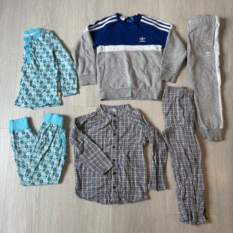 Den mørkeblå buksen er litt slitt/noen små hull (se bilder) og følger med om ønskelig.
