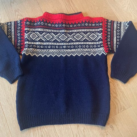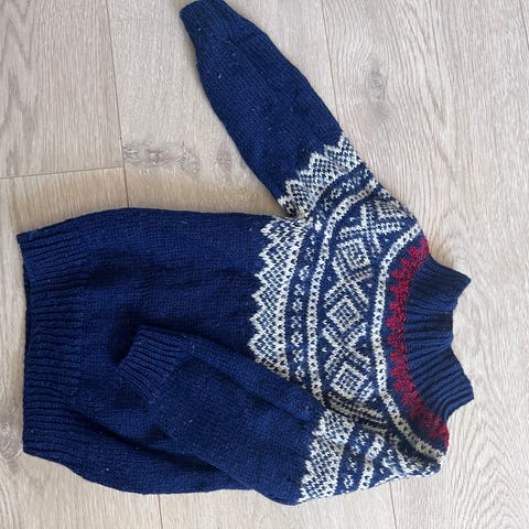 Lite brukt, lite nupper. Genseren har mørkeblå bunnfarge.