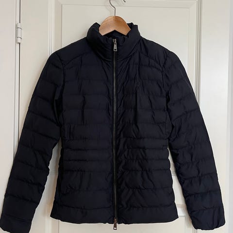 Pent brukt Ralph Lauren RLX dunjakke med snøring i livet i mørk grå farge til salgs. Er også 2-veis glidelås.