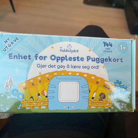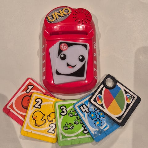 UNO-spill for små barn/baby med5 kort som man kan sette inn i kortleseren. Da lyser boksen og spiller morsom musikk, lyder og uttrykk som introduserer barnet for tall, farger og ting på hvert kort.