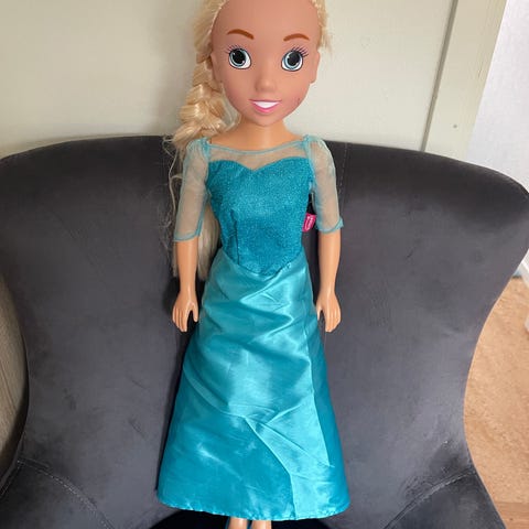 Denne flotte dukken på hele 80 cm vil barnet elske! Dukken kommer med en knelang blå kjole .dukken har lyse hår er samlet i en klassisk dult og den har et blå hårband rundt hode. Dukken har også bevegelige armer og bein .