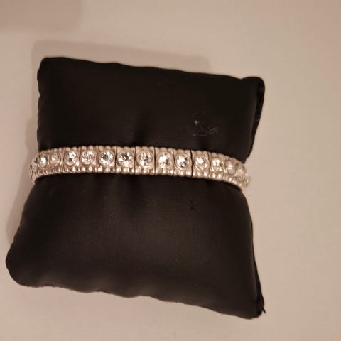 Nydelig gullfarget armbånd med krystaller rundt hele. Strammes med snor bakpå.