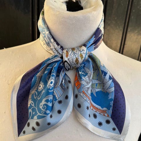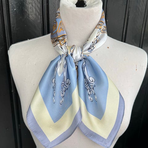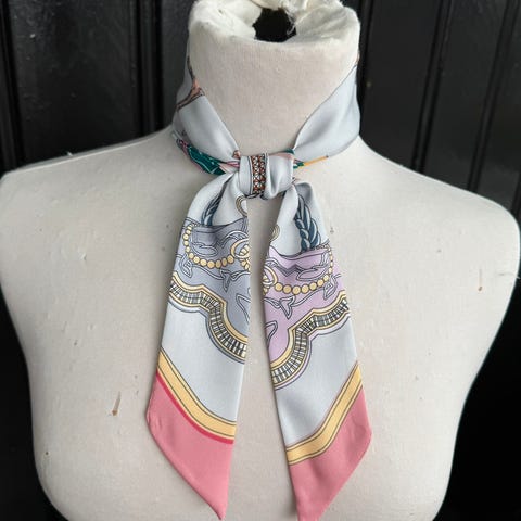 Flott lengde til å knyte i halsen. Dette smale skjerfet også veldig dekorativt som hårbånd, eller rundt hestehalen. Helt nytt og ikke brukt. Lekkert mønster som kan passer til det meste. Kan gjerne sende som brev med posten til 46.-