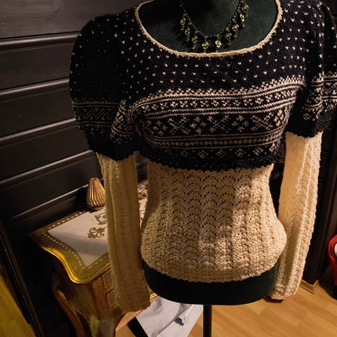 Hjemmestrikket genser. Bunad mønster med perle brosje. Ull. Passer S og M. Lite brukt.