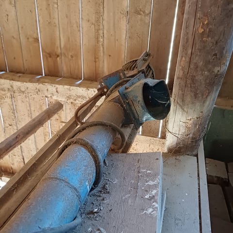 Vi har avsluttet å bruke kraftfor fra silo og selger vårt system for transport av kraftfor fra glassfiber silo til kyrne sitt forbrett. Systemet starter med en oppsamling fra silo, videre 90 cm til en vinkel, og opp ca. 220cm, videre ny vinkel horrisontalt, 600cm og videre ny vinkel for nedslipp til forbrett. I denne enden sitter også motor og på kobling for motorkontakt.