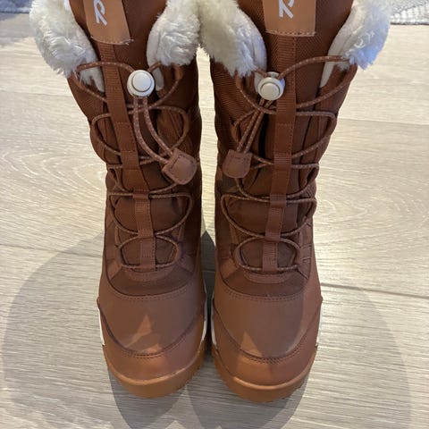 Blå Reimastøvler nr 34. Semsket og kraftig stoff.Kledd med grå fleece inni støvelen. Glidelås på ytterst på innsiden av støvelen. Solid borrelås øverst foran.