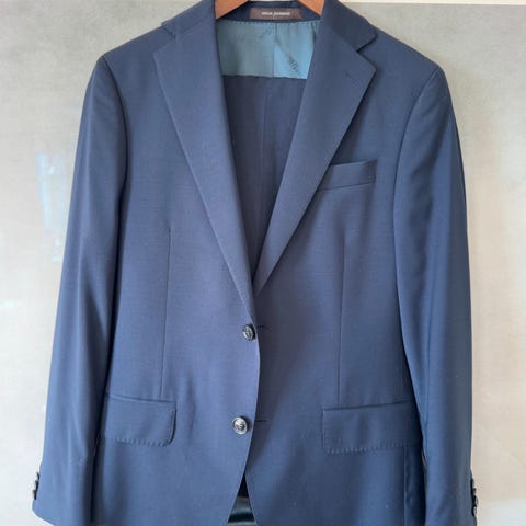 Stilig sort dress str 50 (50C) med diskret striper i mønsteret . Tre lommer og en knapp i front, og tre innerlommer.