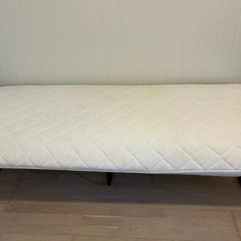 Selger sammenleggbar seng av god kvalitet, 500.- Madrass ca 10 cm tykk, 3-delt for å være sammenleggbar. Lite brukt, har vært brukt på utstilling og er dermed transportert en del, men ingen skader. Noen flekker på madrasstrekk etter transport, kan vaskes vekk. Trekkene har glidelås.