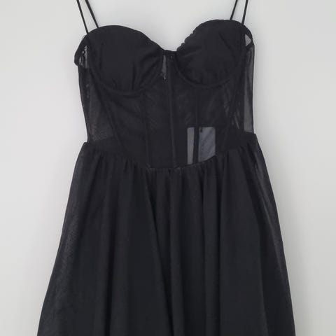 Kort kjole i svart med volangdetaljer. Dyp utringning, åpen rygg og justerbare stropper. Laget i lett stoff. Passer til fest eller en kveld ute.