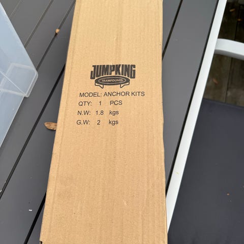 Pro flyer forankringssett til trampoline. Settet er ikke brukt men vi har åpnet esken og rotet bort stroppene.