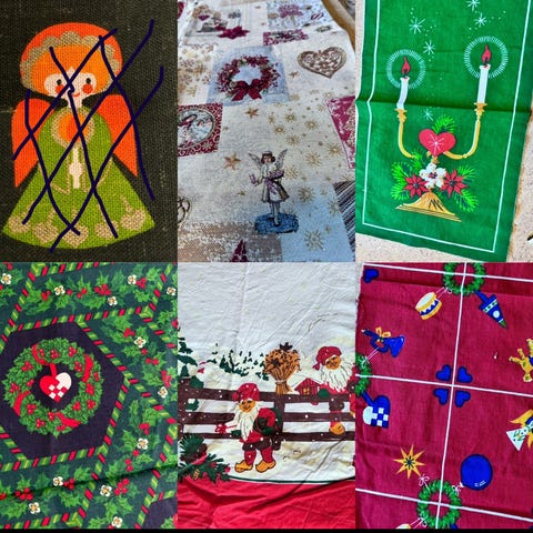 Vev/stoff, garn, nål og arbeidsbeskrivelse